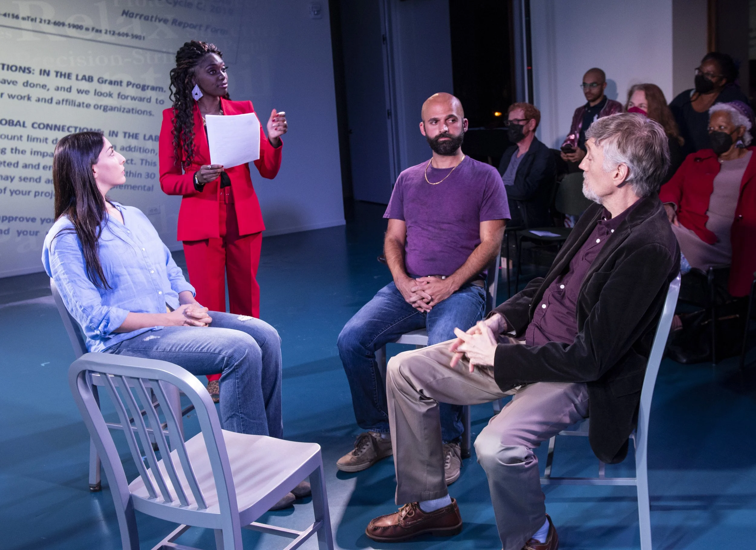 This theatrical chronicle of a cross-cultural crack-up begins with a brand new Executive Director and her former boss returning to the scene of a rehearsal room revolt that set the stage for that artistic director’s departure from the theater he launched with high purpose and blind spots. Restorative Justice is on the agenda but hard to find, as the company reunites and a fictionalized, right-wing Israeli Cabinet Minister materializes uninvited to spar with Eilat and Samad, Israeli and Palestinian theater artists-activists, while their American hosts get caught in the middle, navigating treacherous terrain. They try to mend the unmendable, in a journey of personal loss and learning, reckoning and renewal, push-back, contrition, boycotts and cancel culture – on “both sides” – all hanging in precarious balance.