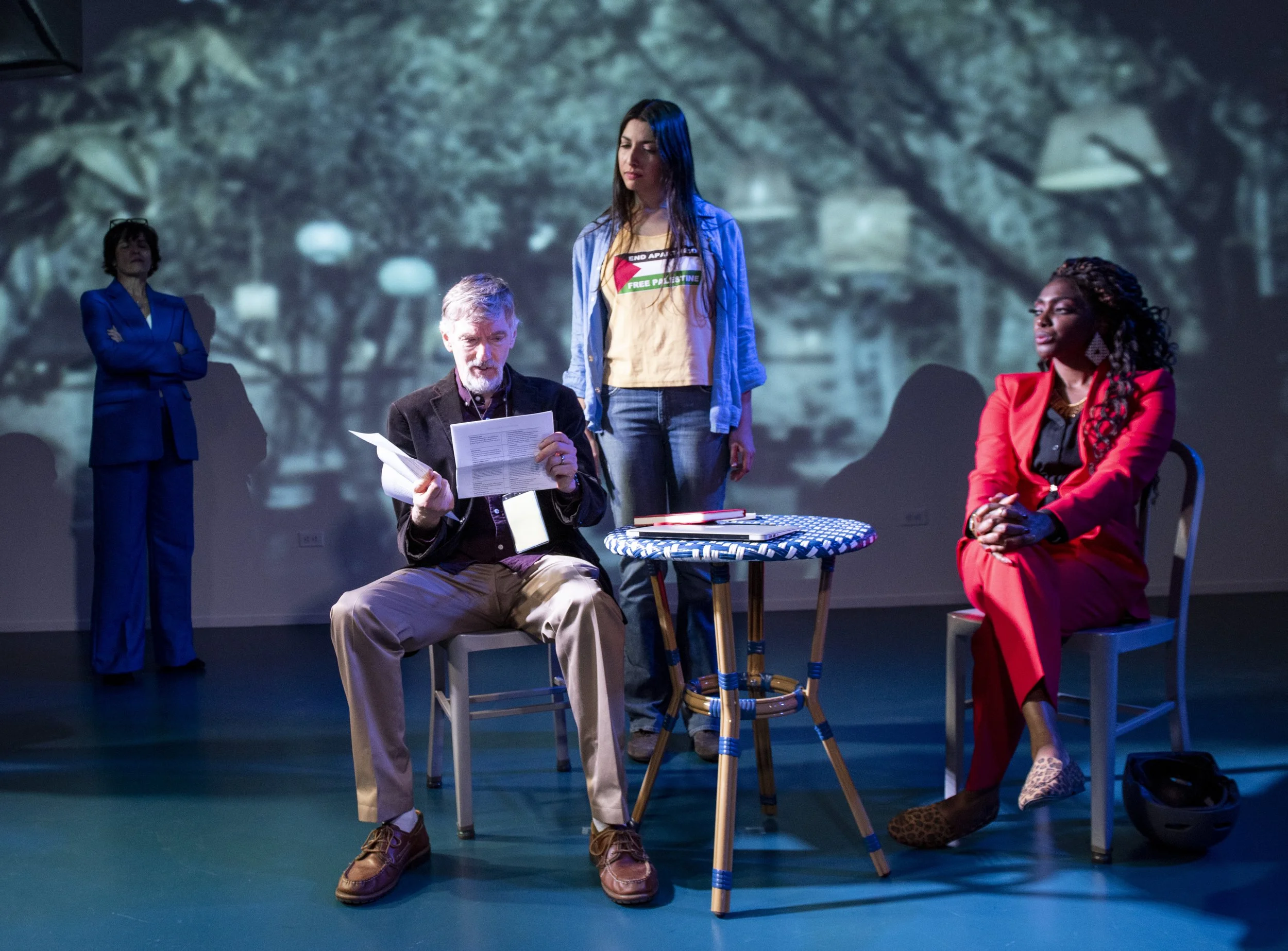 “Calamitous Affair” also asks significant questions related to art, politics and inclusion. Among them: Is bearing forceful political witness incompatible with good theater, which arguably has at its core a push-and-pull between wills and viewpoints? Eye-catching at the back of the largely bare stage, Devin Kinch’s projections — words like “restorative justice” and “protected speech” and video seemingly of protests and security forces in Israel — add philosophical and geopolitical context... Anger, disappointment and, yes, humiliation do figure in the story, judging by scenes of narration and heated debate... The most moving moment sees Virginia suddenly losing her cool, showing us the anguish that evidently underlies her generally upbeat manner. “When you don’t see another’s suffering, and see only your own, it is violence,” she cries. “…. Stop the violence!”